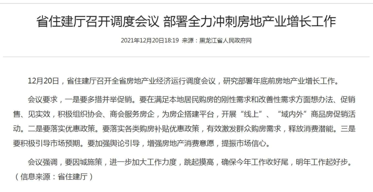 【环球网房产报道】12月20日,黑龙江省住建厅召开全省房地产业经济运行调度会议,研究部署年底前房地产业增长工作。