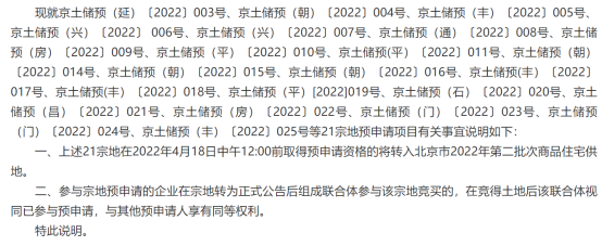 【环球网房产报道】4月18日,根据北京市规自委于4月11日发布《关于2022年已发布预申请公告商品住宅项目有关事宜的说明》,已挂出的预申请用地在4月18日中午12:00前取得预申请资格,转入二批次供地。