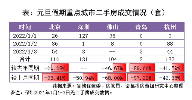 1月4日,诸葛找房数据研究中心发布2022年元旦假期全国重点城市成交报告,数据显示,2022年元旦期间,重点监测的10个城市新房成交1699套,较2021年12月同期下降60.12%,较去年元旦同期下降56.90%。