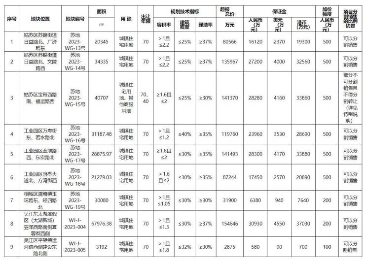 按照苏州市国有土地使用权挂牌出让公告,本批次共推出9宗涉宅地块,其中姑苏区3宗、工业园区3宗、相城区1宗、吴江区2宗。9宗涉宅用地总出让面积为27.8万平方米,起拍总价为89.58亿元。