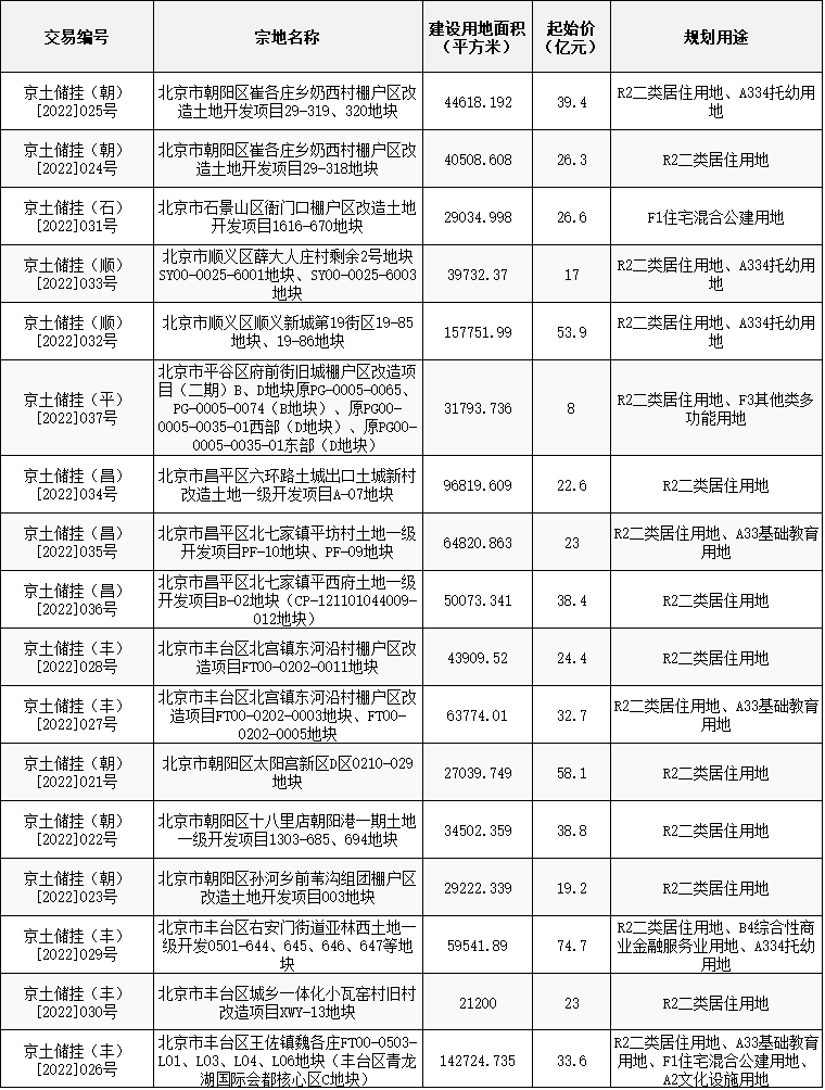 其中,用地面积较大的为顺义区顺义新城第19街区19-85地块二类居住用地、19-86地块托幼用地,用地面积约15.78万平方米,建筑控制规模约18.73万平方米,起始价53.9亿元。
