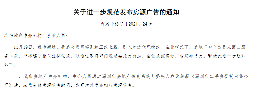 通知指出,深圳新版二手房交易网签系统于11月19日正式上线,引入单边代理模式,在此模式下,房地产中介方更应回归服务本质,自觉规范房源广告发布行为。