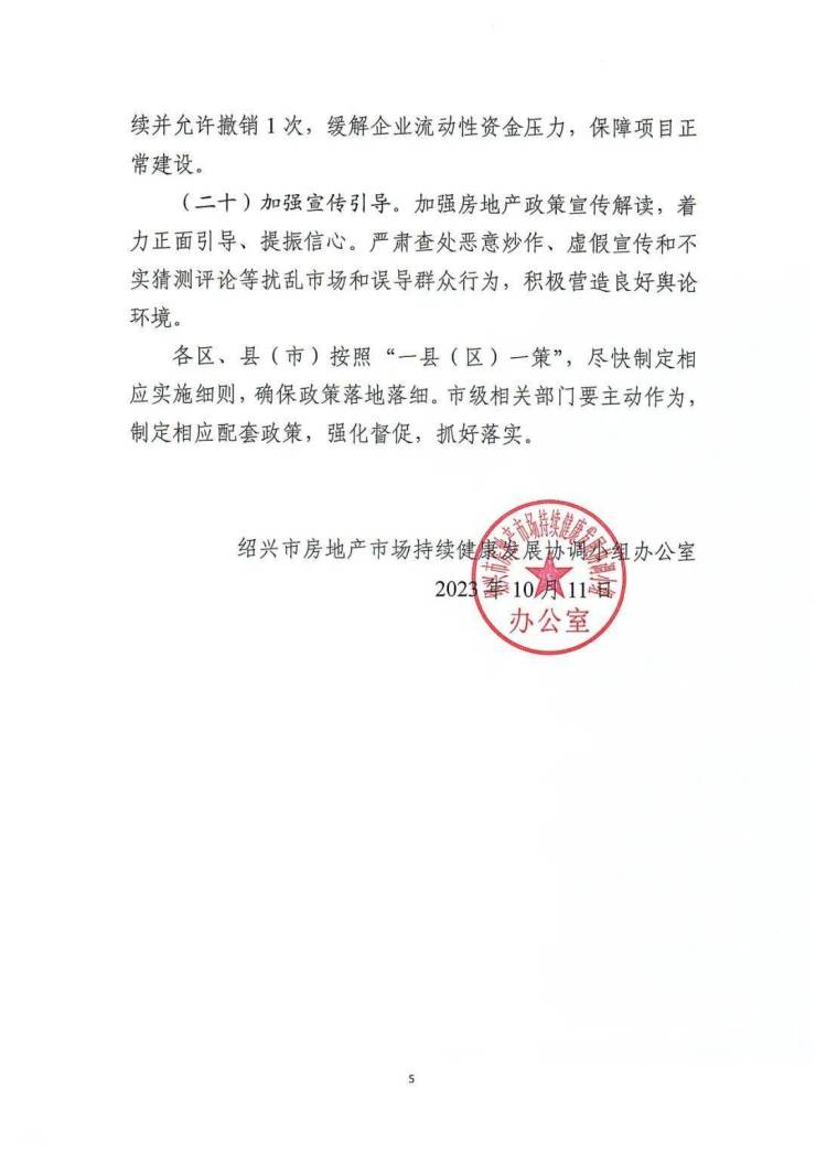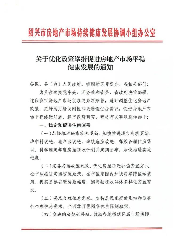 10月11日,浙江省绍兴市房地产市场持续健康发展协调小组办公室发布《关于优化政策举措促进房地产市场平稳健康发展的通知》,《通知》共计五大方面二十条政策。