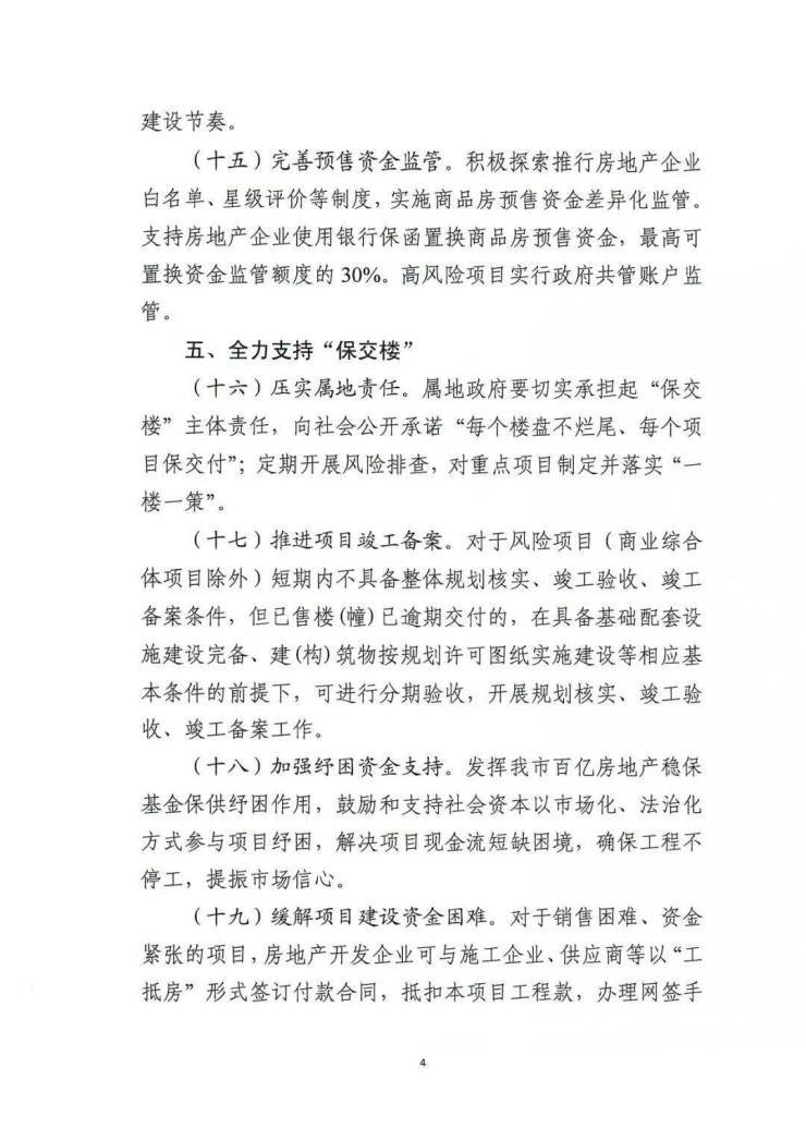 在全力支持“保交楼”方面,政策提出,压实属地责任。属地政府要切实承担起“保交楼”主体责任,向社会公开承诺“每个楼盘不烂尾、每个项目保交付”,定期开展风险排查,对重点项目制定并落实“一楼一策”。