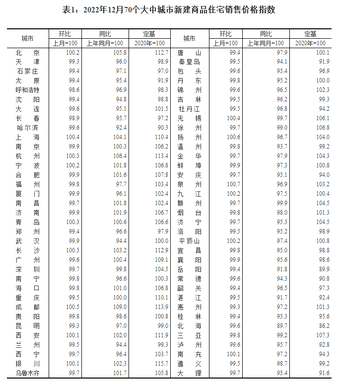 按照国家统计局数据,2022年12月份,70个大中城市中,新建商品住宅销售价格环比下降的城市有55个,比11月份增加4个;房价环比上涨城市15个,较11月增加1个。
