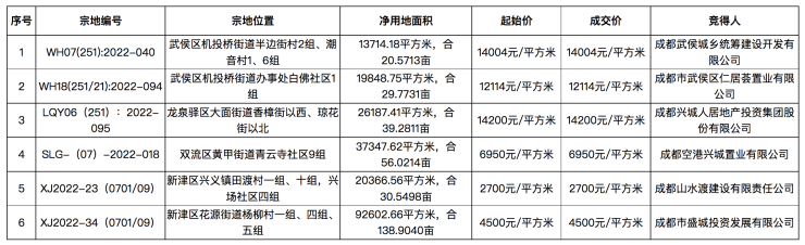 另外14宗地块均以底价成交。其中,本批次宗地限定房价(清水)超过3万元/平方米的另一宗地块为高新区桂溪街道铜牌村9组、10组地块,该地块净用地面积26187.4平方米(合39.2811亩),起拍总价80526万元,宗地限定房价32000元/平方米。按照成交结果,该地块由成都高投置业有限公司底价竞得,成交单价15375元/平方米。