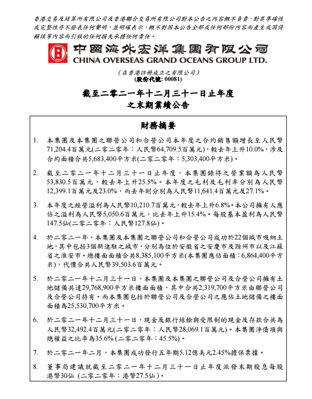 【环球网房产报道】3月23日,中国海外宏洋集团有限公司(00081.HK)发布2021年度业绩公告。