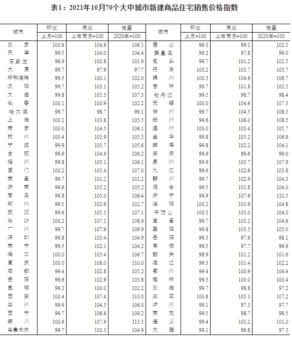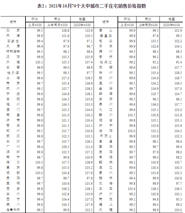 【环球网房产报道】11月15 日,国家统计局发布2021年10月商品住宅销售价格变动情况。国家统计局城市司首席统计师绳国庆对数据进行了解读:2021年10月份,70个大中城市商品住宅销售价格环比总体延续略降态势,同比涨幅继续回落。