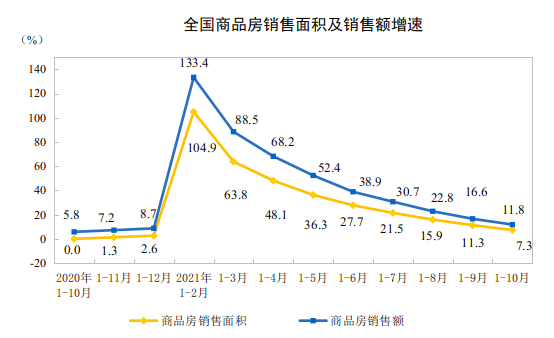 据统计局数据,1-10月份,商品房销售面积143041万平方米,同比增长7.3%;比2019年1-10月份增长7.3%,两年平均增长3.6%,10月同比降幅较上月扩大至21.7%,较9月扩大8.5个百分点。1-10月,商品房销售额为14.7万亿元,同比增长11.8%,比2019年1-10月份增长18.3%,两年平均增长8.8%。10月同比降幅较上月扩大至22.6%,较9月扩大6.8个百分点。