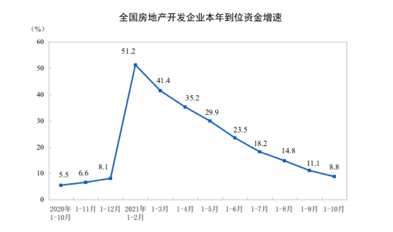 2021年1-10月,全国房地产开发企业到位资金166597亿元,同比增长8.8%。其中,国内贷款20148亿元,下降10.0%;利用外资72亿元,下降35.4%;自筹资金52617亿元,增长5.1%;定金及预收款62040亿元,增长21.0%;个人按揭贷款26678亿元,增长9.7%。