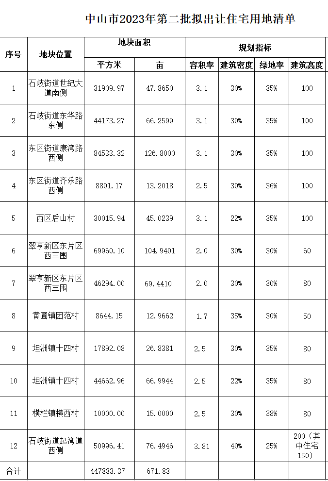 11月6日,广东省中山市自然资源局发布2023年第二批拟出让住宅用地清单,拟出让的12宗宅地面积合计44.79万平方米(折合约671.83亩)。地块拟于2023年10月24日至2024年1月24日期间发布出让公告。