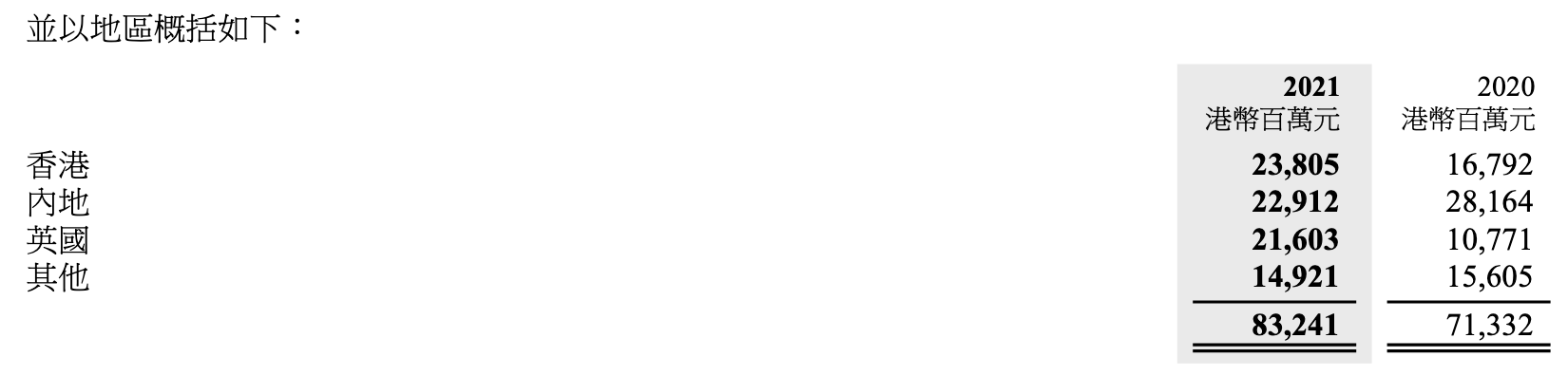 从地区来看,2021年全年,长实集团来自中国香港、内地和来自英国的收入不相上下。其中来自中国香港地区的收入最多,录得238.05亿港元,同比增长41.76%;来自中国内地的总收入229.12亿港元,同比减少18.65%;来自英国的总收入216.03亿港元,同比增长100.57%。