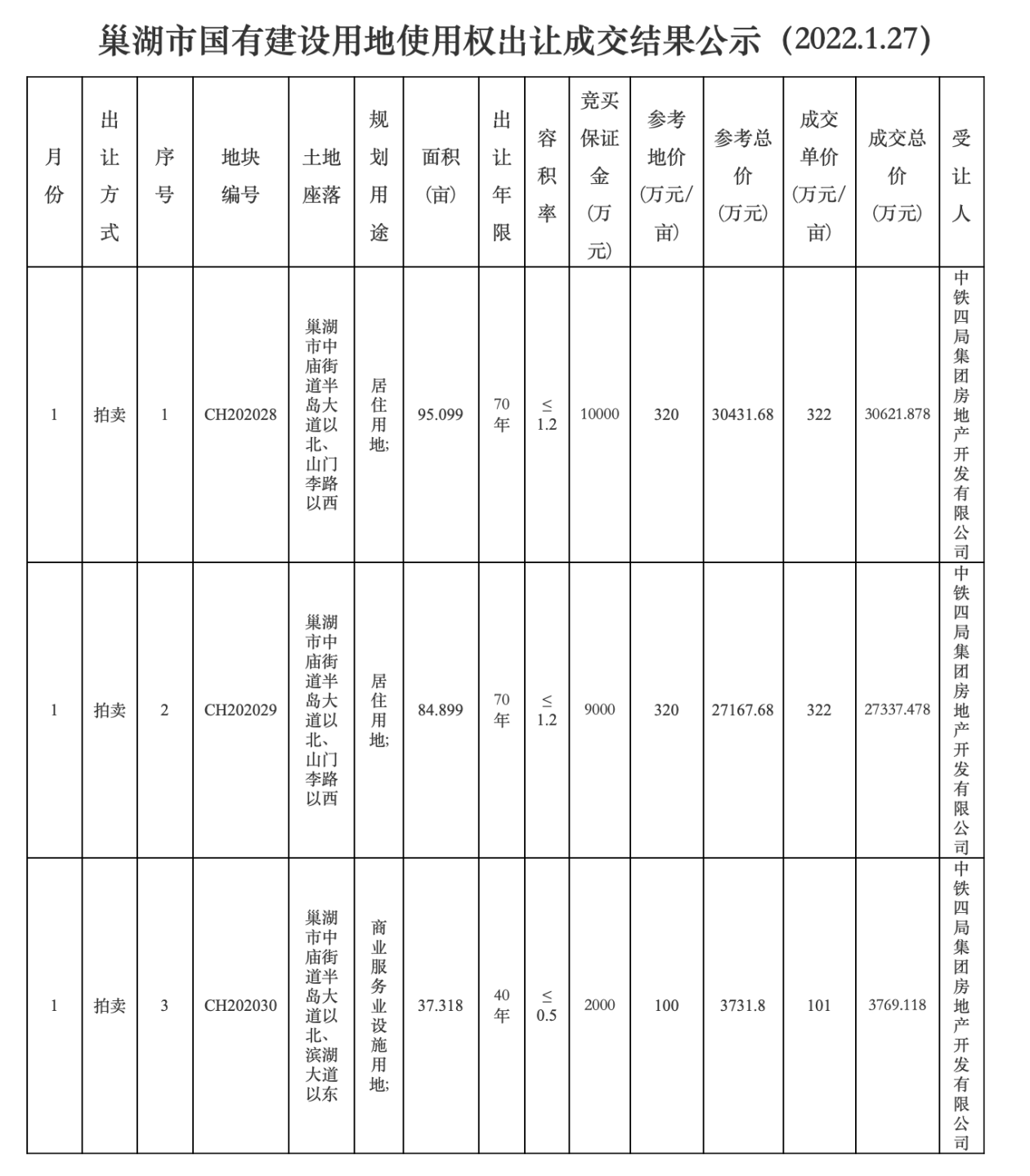 巢湖市CH202030号商业服务业设施用地,由中铁四局以101万元/亩竞得,总价3769.118万元,溢价率1%。