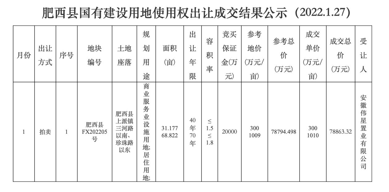 肥西县FX202205号商业服务业设施用地、居住用地,由伟星以1010万/亩竞得,总价78863.32万元,住宅楼面价8416.667元/平方米,溢价率0.099%。
