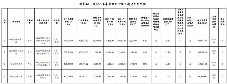 按照募集说明书,万科此次募集的资金拟全部用于项目建设,主要包括珠海、厦门、西安、成都、武汉的5个项目。
