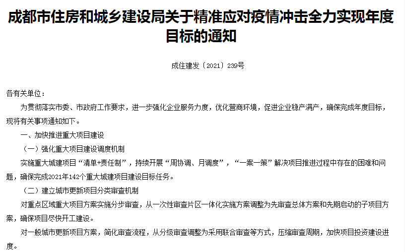 【环球网房产报道】11月23日,成都市住建局公开《关于精准应对疫情冲击全力实现年度目标的通知》, 推出12条措施以推进重大项目建设,其中涉及房地产的部分一共有4条措施。