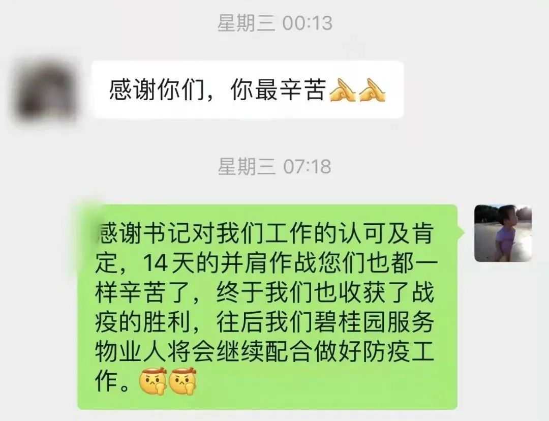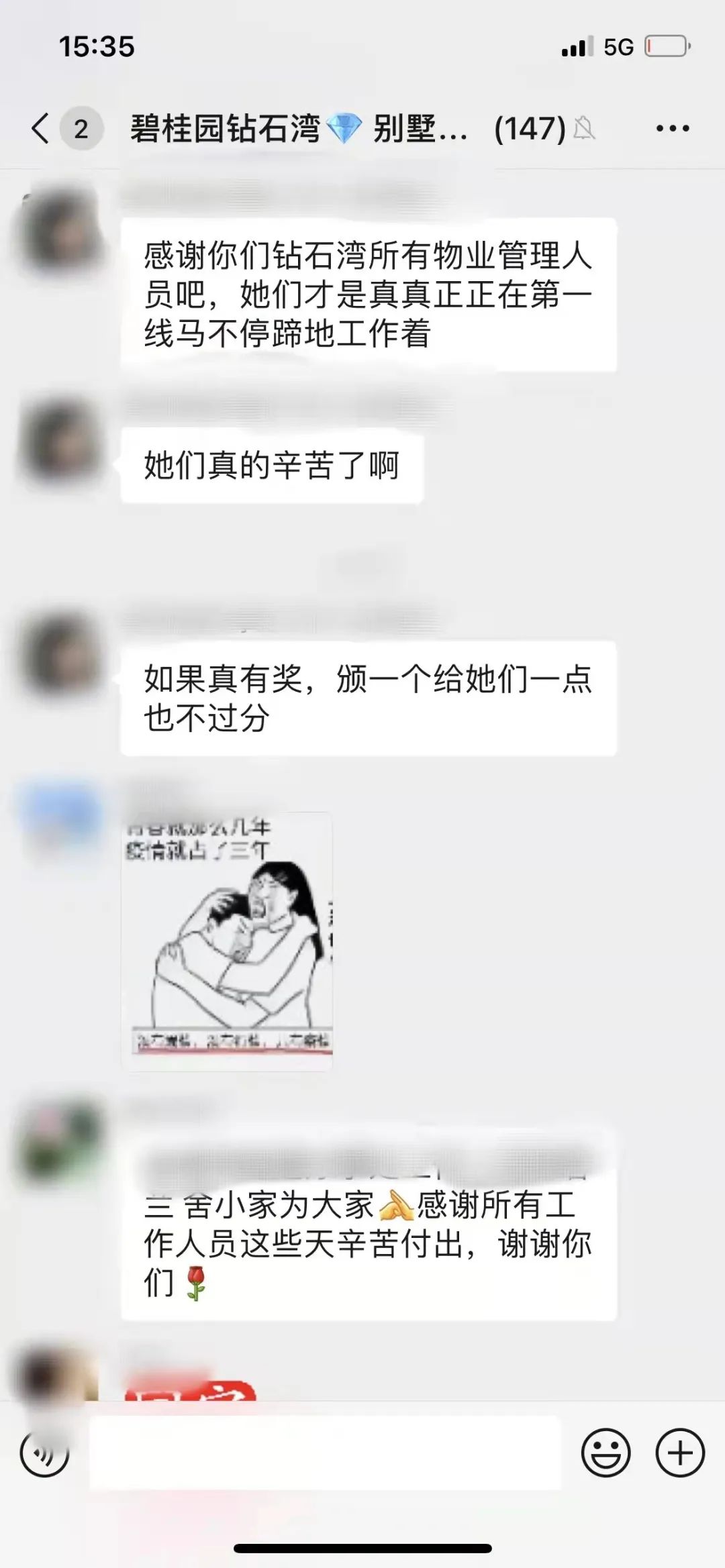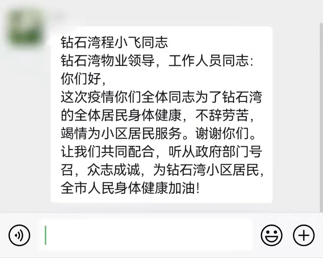 业主赵先生发微信给我。看到业主发来的微信,我是哭着给他回的信息,我们的工作业主都看在眼里,并得到业主的认可,真的很感动,很值得。突然接到这样的紧急任务,也担心、害怕,当时我穿防护服都包裹成这个样了,还能有业主认出我,关心我,确实很感动,想着能尽自己所能,去为园区业主奉献点力所能及的力量。