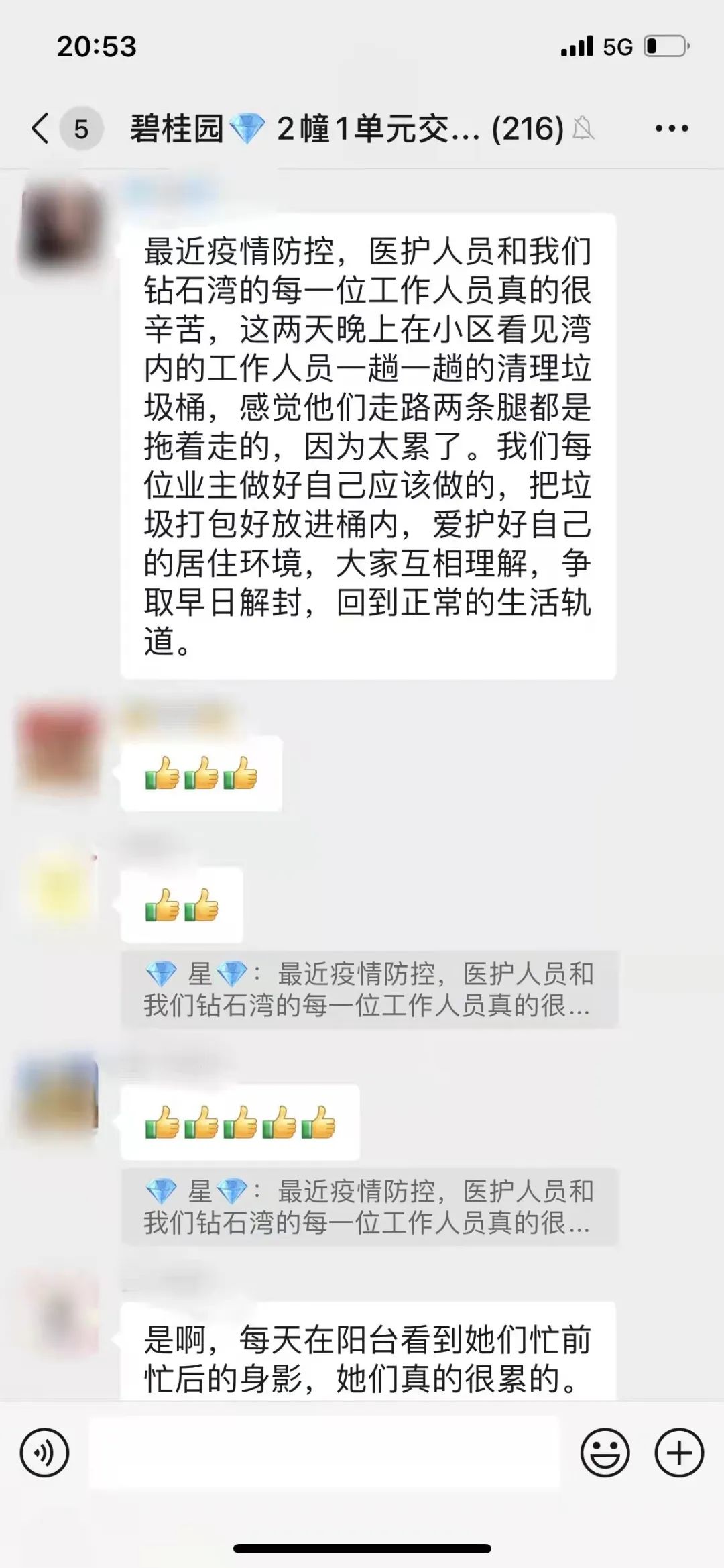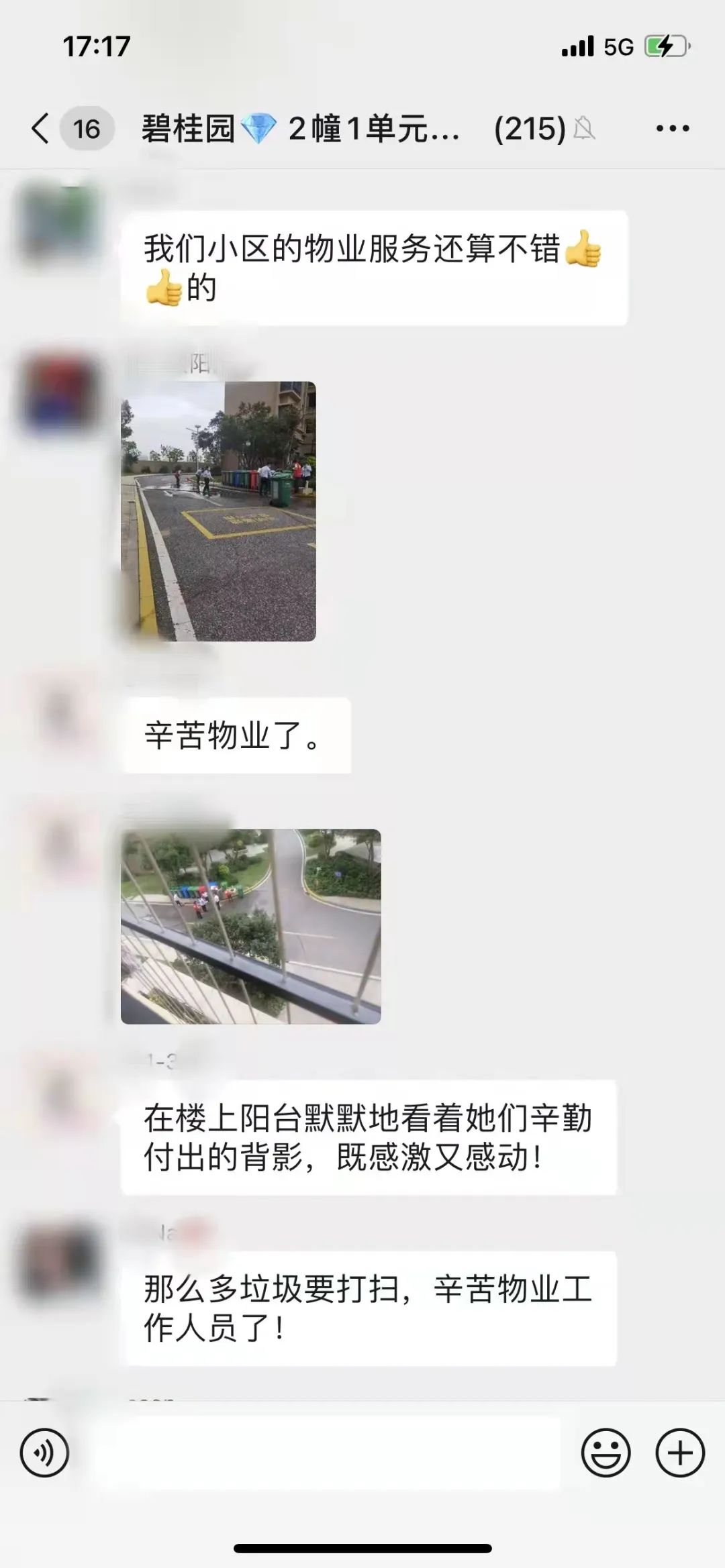 碧桂园服务钻石湾管家团队,贴心、暖心的物业服务,也获得了业主们的认可,纷纷在朋友圈、业主群点赞。据不完全统计,在业主群就有超过3000多条点赞留言,刷屏业主群。