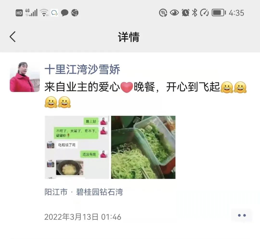 由于碧桂园钻石湾全小区1780多户,住户人数庞大,我们采用的是人休息物资不停休,每一顿饭只有5分钟时间,有时候甚至只能扒两口,又赶在送物资的路上,回来后的饭菜已经凉透不能再吃。使命所系,责任在肩,一刻不敢怠慢。我告诉我自己抗疫面前,必须要坚持到底,小区可以快点恢复以前生机勃勃的景象。