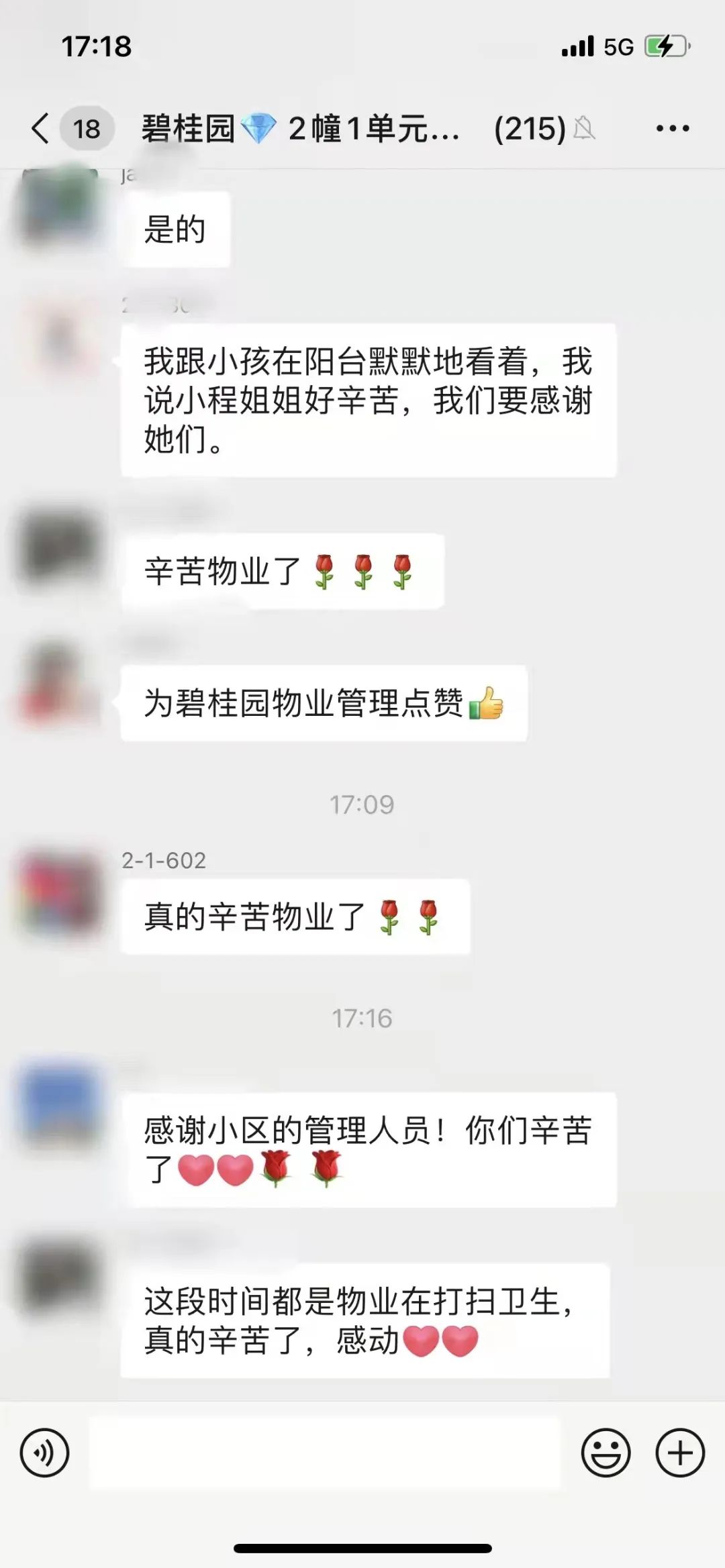 “在楼上阳台默默地看着她们辛勤付出的背影,既感激又感动,辛苦物业工作人员了”!