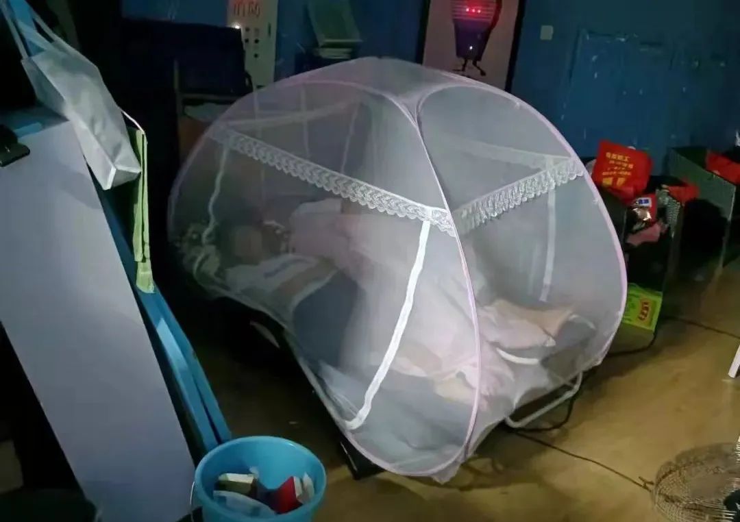 由于封控小区我们都不能回家,所以每天上班休息都在苑区里面,在架空层这里搭建简易床铺,这就是我的“家”了。