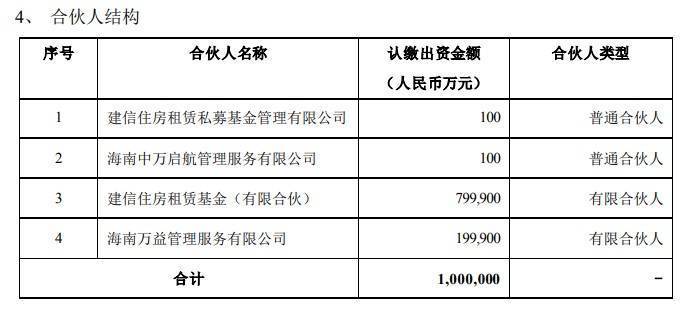 其中,万科下属子公司中万启航认缴出资金额为人民币100万元,万益管理认缴出资金额为人民币19.99亿元,合计占建万住房租赁基金的比例为20%。