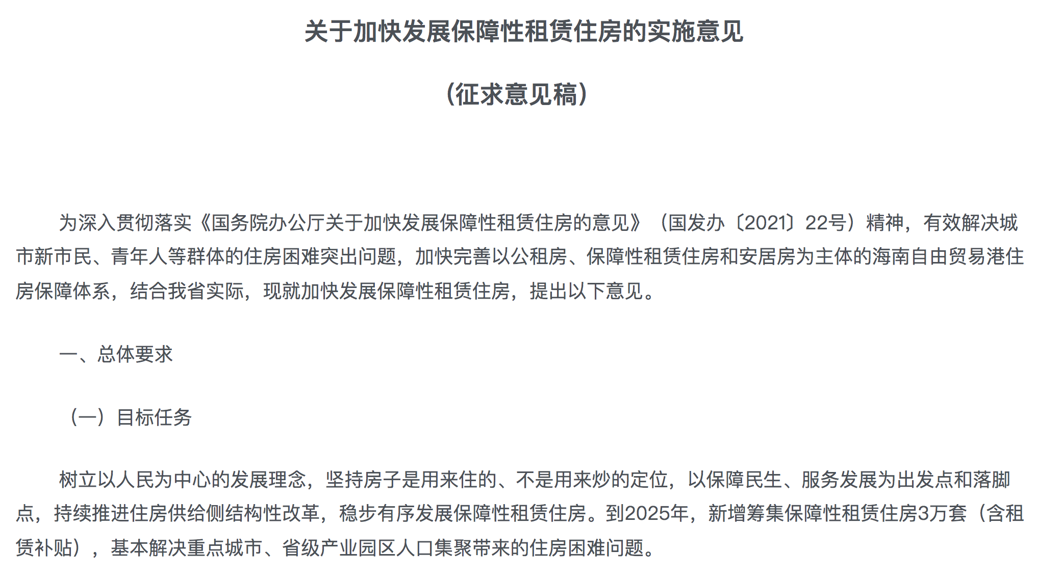 按照《征求意见稿》的目标任务,到2025年,海南省计划新增筹集保障性租赁住房3万套(含租赁补贴),基本解决重点城市、省级产业园区人口集聚带来的住房困难问题。