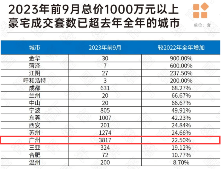 值得注意的是,据克瑞统计,今年前三季度,包括广州在内的15个城市,千万级豪宅成交套数均已赶超2022年全年成交套数。