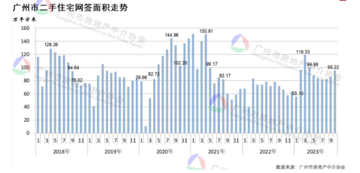 二手房方面,据广州市房地产中介协会统计,2023年10月(统计周期为9月26日-10月25日),广州市二手住宅整体网签(中介促成+自行交易)共9361宗和95.22万平方米,环比分别增长9.56%和11.23%。