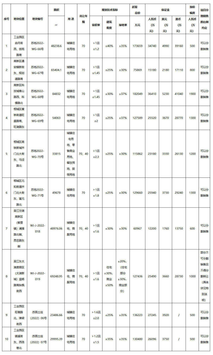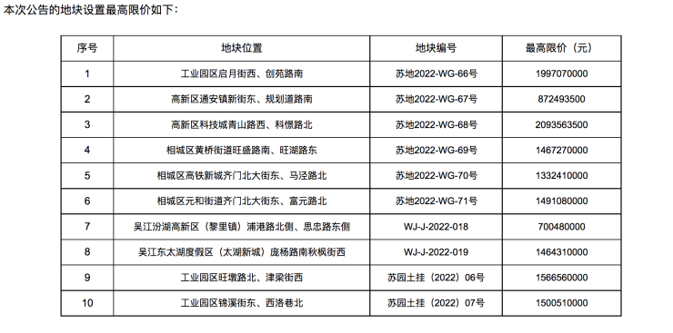 11月4日,江苏省苏州市自然资源和规划局发布《苏地网挂〔2022〕11号 苏州市区国有建设用地使用权网上挂牌出让公告》,第五批次集中供地共推出10宗地块,总出让面积50.77万平方米,起拍总价为125.98亿元,并将于12月5日进行限时竞价。