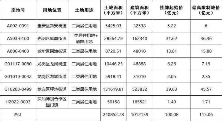 在推出的7宗地块中,挂牌起始价最高的地块为龙岗区坪地街道G10203-0499地块,该地块土地用途为居住用地,土地面积131619.81平方米,挂牌起始价39.63亿元。
