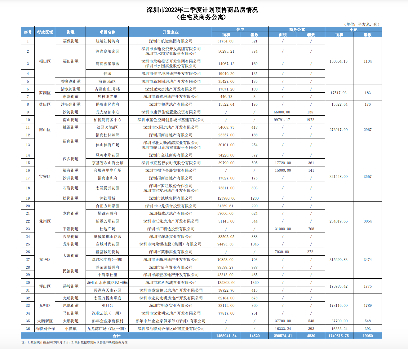 4月12日,深圳市住房和建设局发布《关于我市2022年二季度商品住宅和商务公寓房源信息情况的公示》,截至2022年4月12日,深圳市2022年二季度计划入市的商品住宅及商务公寓项目36个,预计供应房源面积为174.95万平方米、19050套,其中:住宅145.89万平方米、14520套;商务公寓29.06万平方米、4530套。