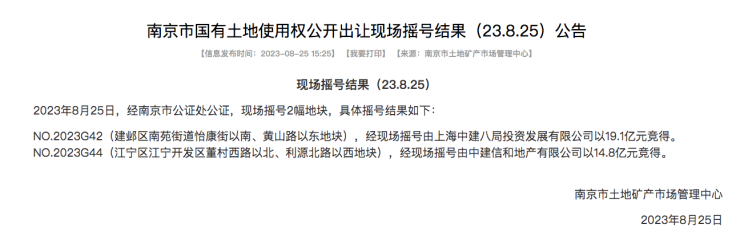地块出让信息显示,NO.2023G42号为建邺区南苑街道怡康街以南、黄山路以东地块,该地块东至腾达雅苑农贸市场;南至苏建艳阳居;西至黄山路;北至怡康河,该地块出让面积18483.73平方米,起始楼面价37533元/平方米,上限楼面价42943元/平方米。按照中指监测数据,该地块吸引超20家房企报名,包括万科、国贸、保利、华发、招商、中海、象屿、绿城、鼎信长城、栖霞建设、金隅、越秀、中铁建、中天美好等。仅30秒、7轮竞价便已触顶进入摇号阶段,经现场摇号,地块由上海中建八局投资发展有限公司以19.1亿元竞得,成交楼面价43058元/平方米,溢价率14.71%。