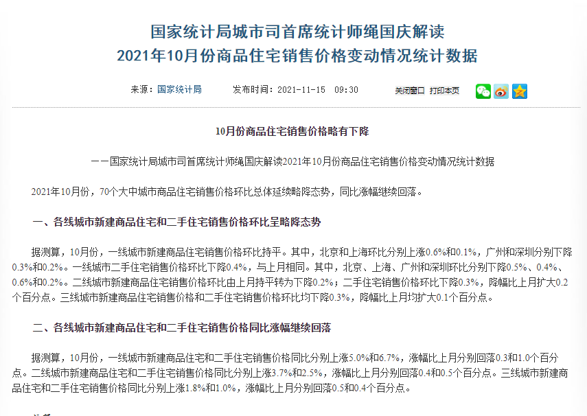 统计局:10月份70城新房、二手房价格环比略降 同比涨幅回落
