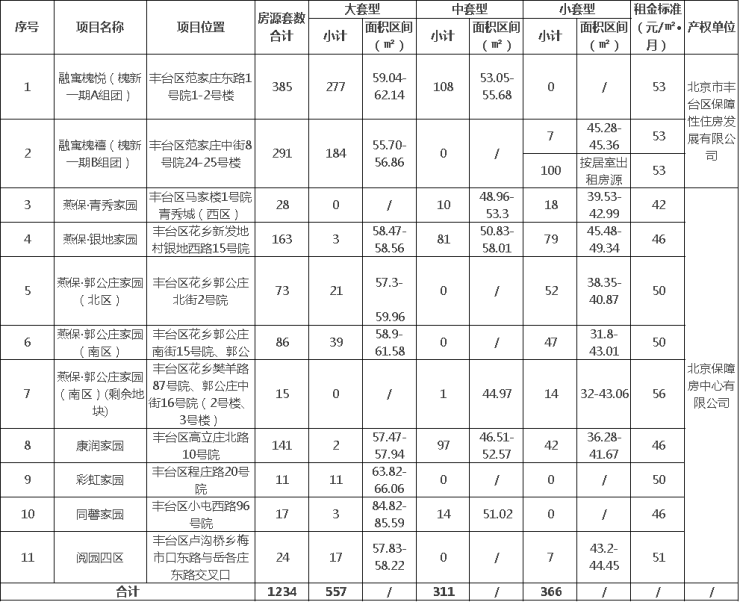 据悉,此次丰台配租的11个公租房项目共有1234套房源。其中,大套型557套,中套型311套,小套型366套。为充分发挥部分大套型公租房资源效用,加快解决公租房单身家庭住房困难,本次配租将融寓槐禧项目50套两居室房源按居室拆分,纳入小套型房源选房范围,面向单身家庭分居室出租。