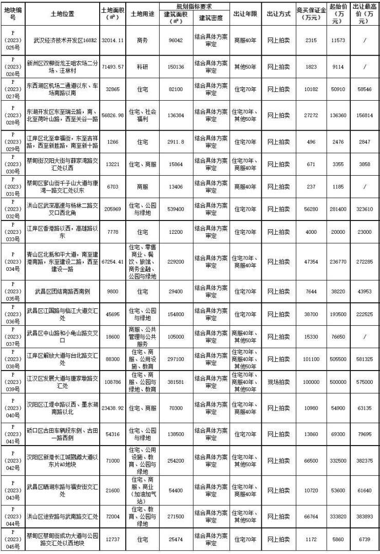 6月9日,武汉发布武告字(2023年)8号拍卖公告,此次共出让21宗地块,土地总面积102.17公顷,规划建筑面积305.99万平方米,起始总价约291.70亿元。其中:住宅类用地17宗、面积约89.29公顷,起始总价约281.85亿元;商业类用地4宗、面积12.88公顷,起始总价约9.85亿元。该批次项目将于2023年6月30日集中举行拍卖活动。