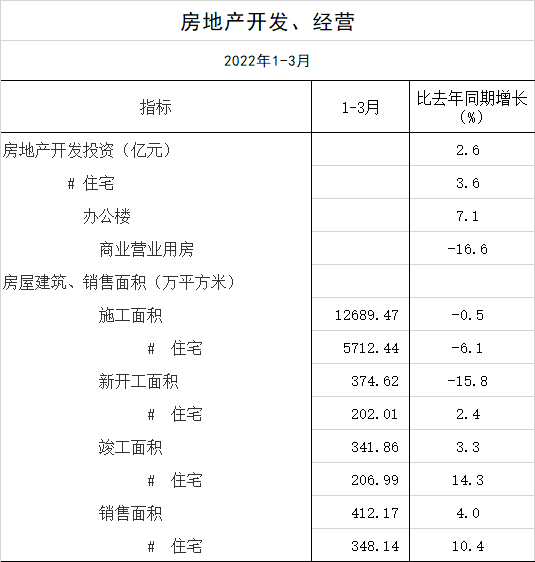 具体看,商品房施工面积12689.47万平方米,下降0.5%。其中,住宅施工面积5712.44万平方米,下降6.1%。商品房新开工面积374.62万平方米,下降15.8%。其中,住宅新开工面积202.01万平方米,增长2.4%。商品房竣工面积341.86万平方米,增长3.3%。其中,住宅竣工面积206.99万平方米,增长14.3%。商品房销售面积412.17万平方米,增长4.0%。其中,住宅销售面积348.14万平方米,增长10.4%。