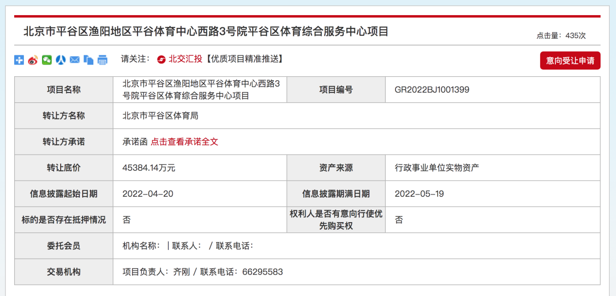 按照公开信息,该项目转让方为北京市平谷区体育局,转让底价为4.538414亿元人民币。