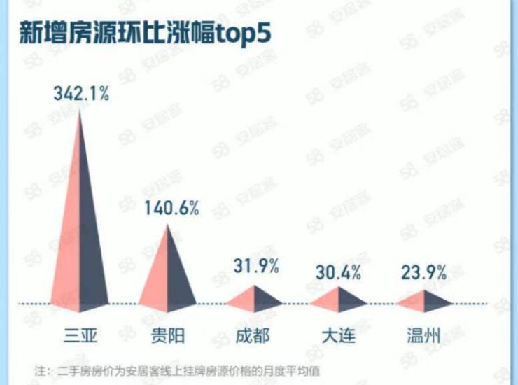 在新增挂牌房源量方面,三亚、贵阳、成都、大连、温州等城市的二手房新增挂牌房源量涨幅较高,其中三亚环比上涨超过3倍,贵阳环比涨幅达到140.6%。