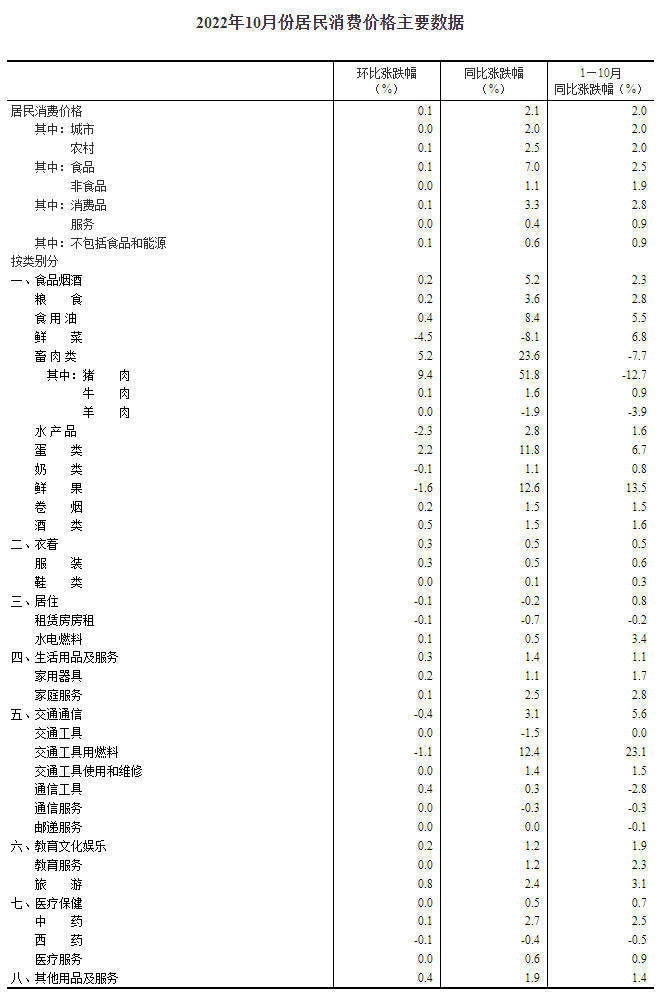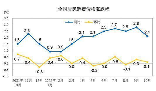 国家统计局:10月份CPI同比上涨2.1% 环比上涨0.1%