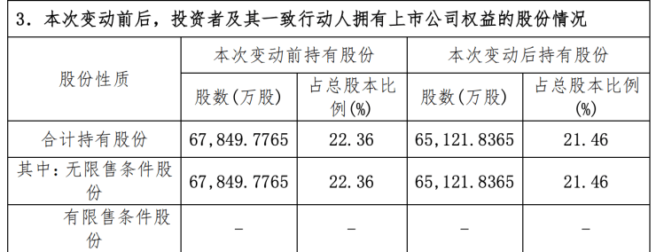 在此次减持之后,苏宁环球集团持有的股份从67849.7765万股降至65121.8365万股,持股比例从22.36%降至21.46%。