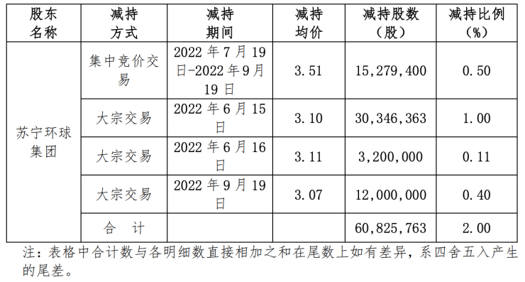 公告称,2022年9月20日,公司收到大股东苏宁环球集团出具的《关于减持计划进展情况的告知函》,苏宁环球集团在2022年7月19日至2022年9月19日通过集中竞价方式减持公司股份1527.94万股,占公司总股本的0.5%;2022年9月19日通过大宗交易方式减持公司股份1200万股,占公司总股本的0.4%;合计减持27279400股,占公司总股本的0.9%。苏宁环球集团2022年6月16日通过大宗交易方式减持公司320万股,合并计算自2022年6月16日至2022年9月19日,通过集中竞价和大宗交易方式合计减持公司股份比例达到1%;自2022年6月15日至2022年9月19日,通过集中竞价和大宗交易方式已累计减持公司股份60825763股,占公司总股本的2%,减持计划实施的减持数量已过半。
