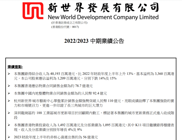 公告显示,新世界发展2022/2023财年中期(2022年6月-12月)综合收入为401.93亿港元,比2022年财年上半年同比上升13%;实现基本溢利为33.6亿港元,股东应占溢利为12.09亿港元,分别同比下降14%、15.03%。