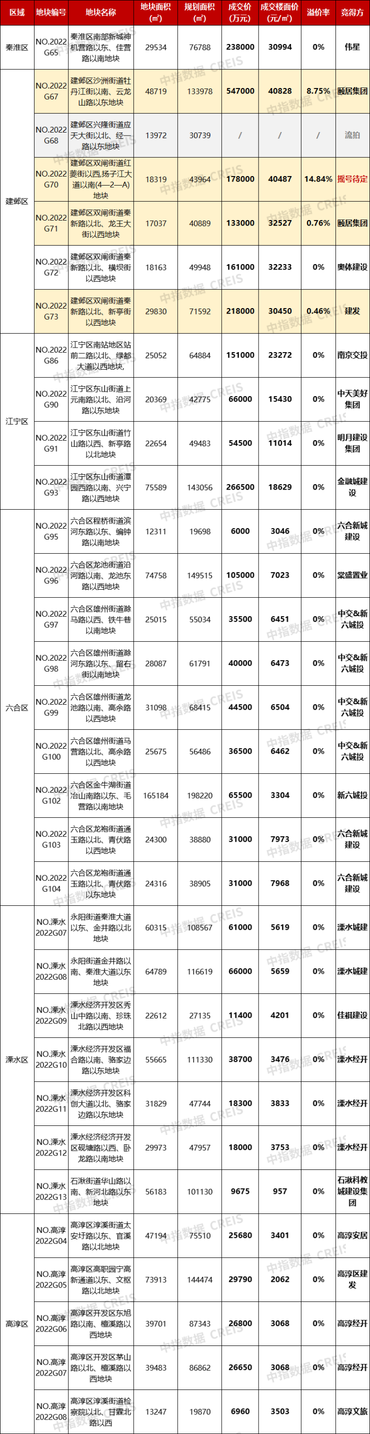 据了解,本次供地价格最高的为建邺区的NO.2022G67号地块,起始价50.3亿元,最终由颐居集团以54.7亿元竞得,溢价率8.75%,该地块也是本次单价最高的地块,单价为40828元/㎡。