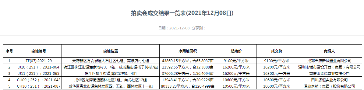 除了上述天府新区TF(07):2021-28地块外,本场剩余5宗溢价成交的地块分别为: