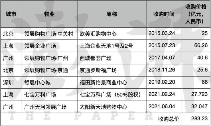 根据领展此前发布的公告,这7个物业项目为领展分别于2015年至2021年收购。其中北京2个,为领展购物广场·中关村与领展购物广场·京通;上海2个,为领展企业广场与七宝万科广场50%股权;广州2个,为领展购物广场·广州与广州天河领展广场;深圳1个,为领展中心城。