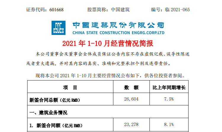 原标题:中国建筑:前10月新签合同总额26604亿元 同比增长7.5%