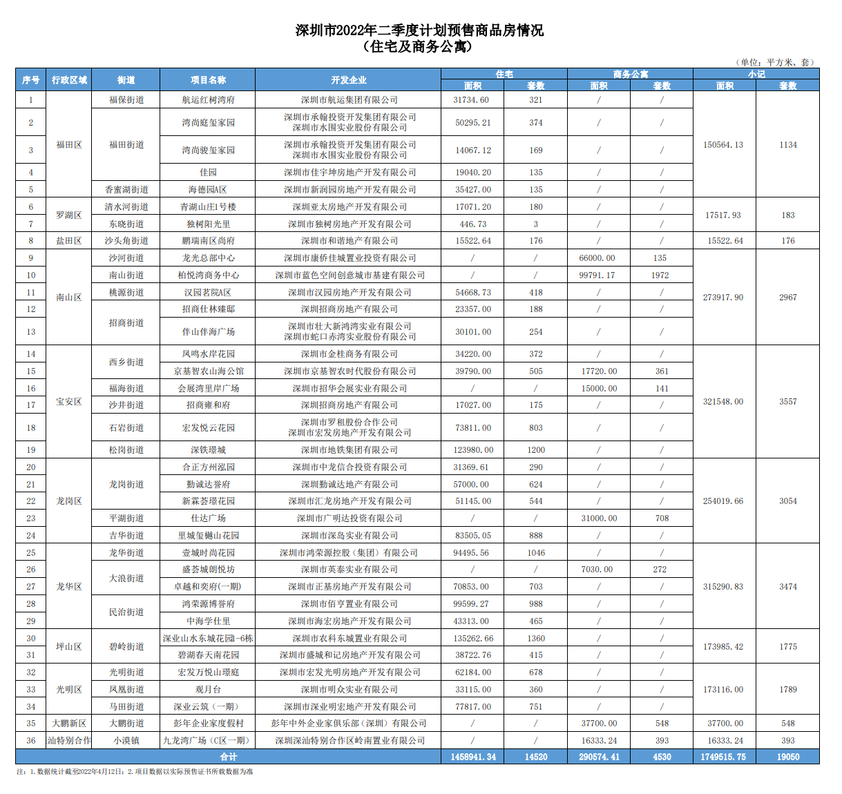 截至2022年4月12日,深圳2022年二季度计划入市的商品住宅及商务公寓项目共有36个,预计供应房源面积为174.95万平方米,共计19050套,其中住宅145.89万平方米,计划入市14520套;商务公寓29.06万平方米,计划入市4530套。