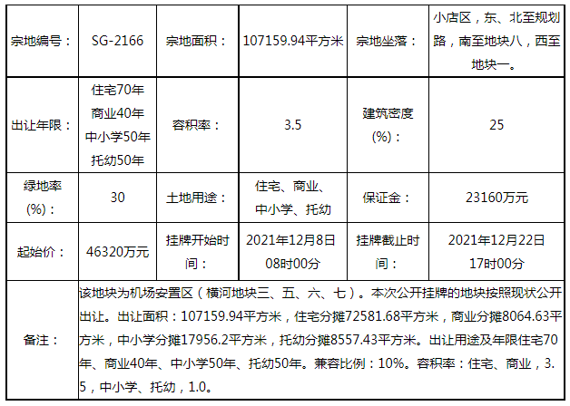 据了解,SG-2166地块位于小店区,土地面积107160平方米,住宅兼容商业、中小学、托幼用地,容积率3.5,起始价4.63亿元,起始楼面价1235元/平方米。