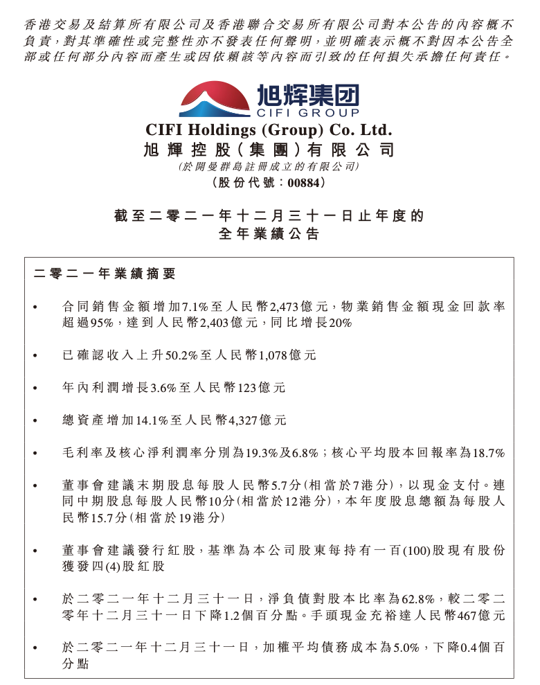 旭辉控股2021年实现营收1078亿元 归属股东净利润76.